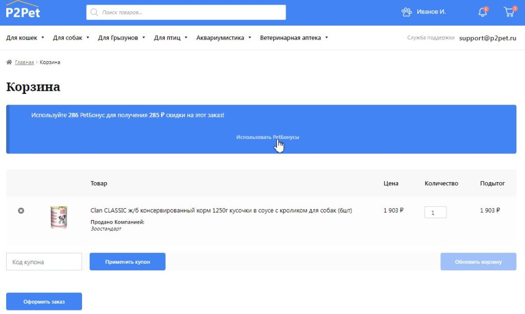 Количество PetБонусов, которые вы можете применить к заказу отображается в Корзине во время оформления заказа.